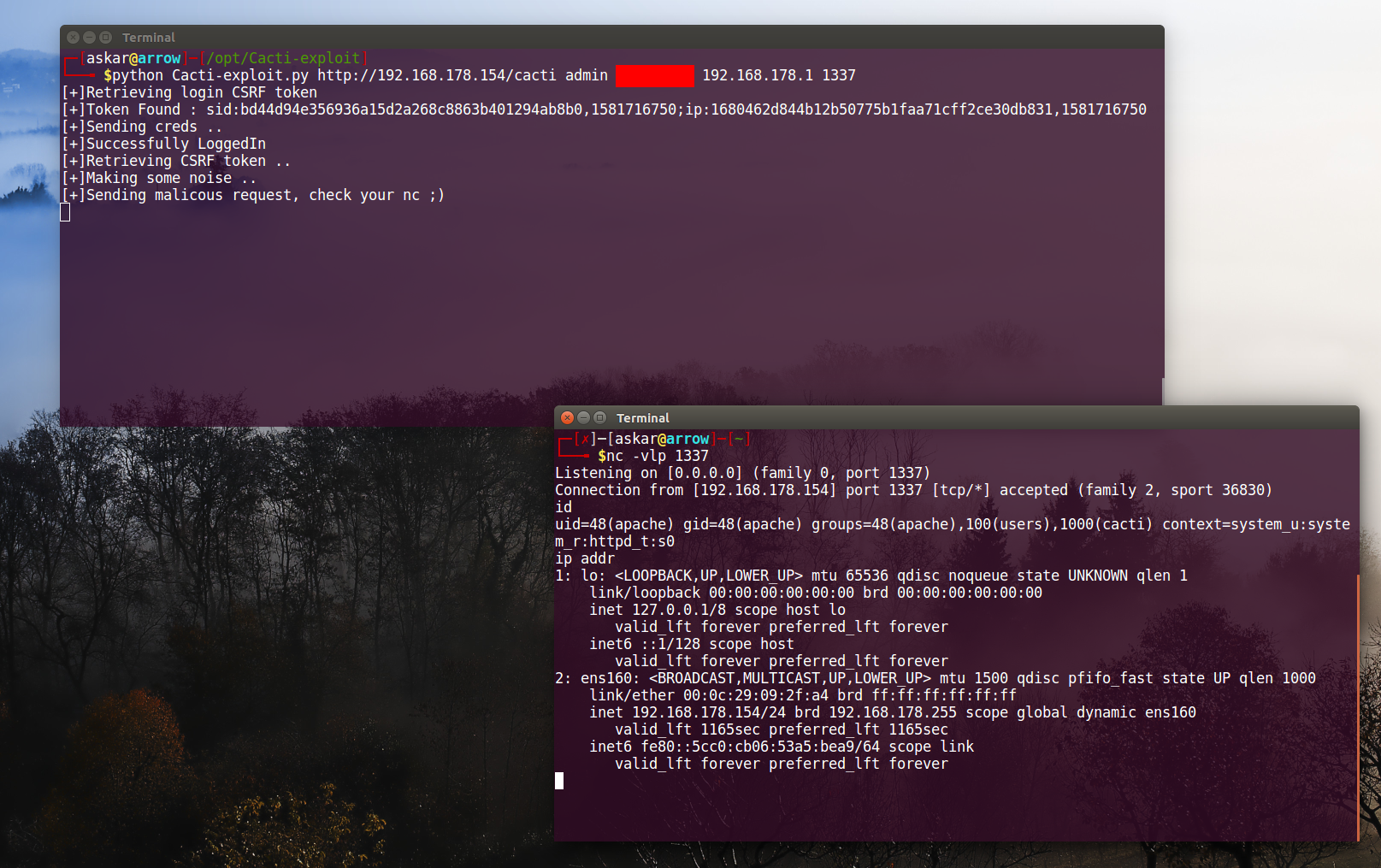 print("[~] Usage : ./Cacti-exploit.py url username password ip port")